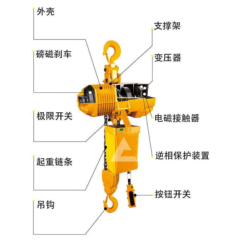 環(huán)鏈電動葫蘆是由電機(jī)、減速器、制動器、起重鏈條、吊鉤等多個零部件組成的,電機(jī)是電動葫蘆的動力源,通過減速器把電機(jī)的高速旋轉(zhuǎn)轉(zhuǎn)換成鏈條的低速旋轉(zhuǎn),用來進(jìn)行貨物的起重操作。制動器是用來控制貨物的速度和停止的裝置,鏈條和鏈輪是礦用電動葫蘆的核心部件,共同完成了貨物的上升和下降等操作。